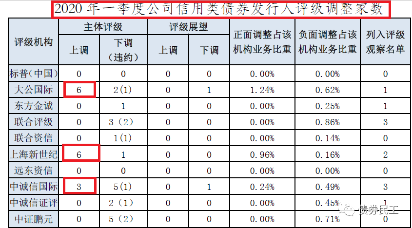 同期對比來看,僅在2020年第一季度,主體評級上調的發行人數量就已經有15家,主體評級下調的發行人數量為13家,監管新規之后的對比數據還是很明顯的。