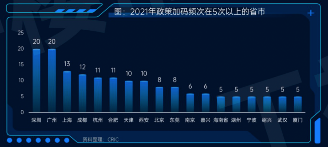 其中,深圳、廣州政策加碼多達(dá)20次,深圳重點(diǎn)強(qiáng)化信貸資金管控,并以“深房理”被查處作為政策加碼的最高峰;廣州分區(qū)域精準(zhǔn)化調(diào)控,天河、黃埔、南沙等熱點(diǎn)區(qū)域依據(jù)市場(chǎng)實(shí)際情況,針對(duì)性地調(diào)整政策措施;上海多管齊下嚴(yán)堵政策監(jiān)管漏洞,政策加碼同樣達(dá)到13次。