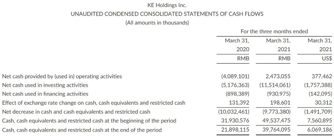 現(xiàn)金流方面,相比2020年底,貝殼找房的現(xiàn)金及現(xiàn)金等價物有所下降。2021年一季度末為268.8億元,比2020年底的409.7億元少了100多億元,亦低于2020年三季度的380.5億元,比2020年1季度的155.4億元高出不少。