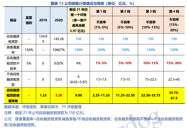 雖然20年公司才出現第一筆不良資產(一筆醫院租賃項目,0.03億元),但20年以來受疫情等因素影響較多,當前公司的關注+不良資產應有較大幅度上升。故本文將公司的不良率分成四個檔次,分別計算出不同情況下所需計提的壞賬準備金額。結果顯示,因公司成立初期拓客渠道有限,大中型客戶較多,整體客戶集中度較高,再加上基數較?。ㄙY產規模小、計提準備金也小),只要有一筆大單客戶成為壞賬,公司的計提壓力就會有顯著拉升(整體測算過程較悲觀,僅作為模糊體現公司壞賬壓力的量化結果,實際情況有待公開信息披露)。在極端情況下,母公司的資金援助將成為公司抗風險的關鍵。