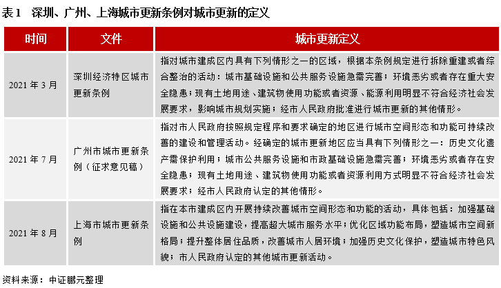 我國的城市更新實(shí)踐地方先行,當(dāng)前深圳、廣州、上海等城市更新創(chuàng)新實(shí)踐的排頭兵已經(jīng)形成了各具自身特色的城市更新模式。其定義方面,國家層面尚未對(duì)城市更新專門立法,但是深圳、廣州、上海發(fā)布了各自的城市更新條例。其中,《深圳經(jīng)濟(jì)特區(qū)城市更新條例》于2021年年3月1日起施行;《上海市城市更新條例》于2021年8月25日正式發(fā)布;廣州于2021年7月發(fā)布了城市更新條例征求意見稿。三個(gè)城市對(duì)城市更新做出的具體定義如表1所示。
