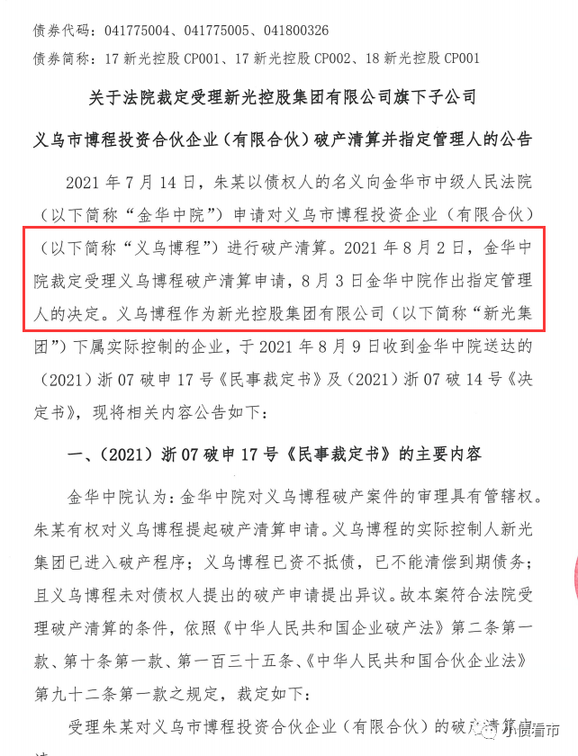 8月9日,新光控股集團有限公司(以下簡稱“新光控股”)公告稱,金華中院裁定受理旗下子公司義烏博程破產(chǎn)清算申請,并指定律師、會計師事務(wù)所擔(dān)任其管理人。