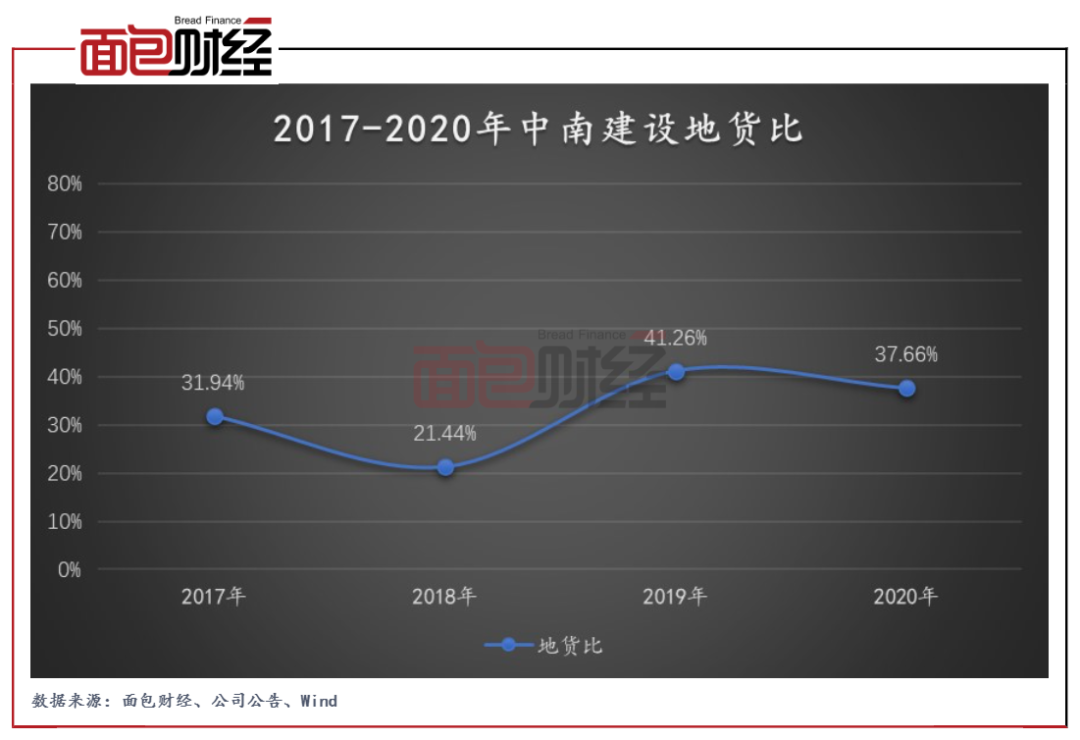 2020年,中南建設新增項目107個,規劃建筑面積合計約1523萬平米,同比增長54%;拿地金額為762億元,同比增長46.7%;平均樓面價5002元/平米,略低于2019年但仍維持較高水平。