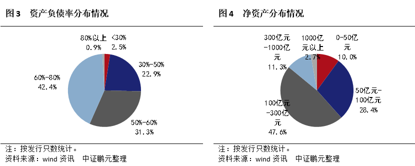 從財務狀況來看,剔除掉近兩年沒有連續財務數據的發行主體,共計1,584家發行主體,這1,584家總體上財務實力較強。具體來看,以凈資產而言,凈資產在100億元以上的發行主體占比超過了60%;以資產負債率而言,資產負債率在60%以下的發行主體占比超過了50%;以近兩年收入增長的穩定性情況來看,2020年收入同比增長的發行主體有1,068家,占比67.42%,近兩年收入同比增長的發行主體有824家,占比52.02%;以收入的多元化程度而言,所有主體均有兩種以上的收入來源,大部分主體有市場化收入來源。