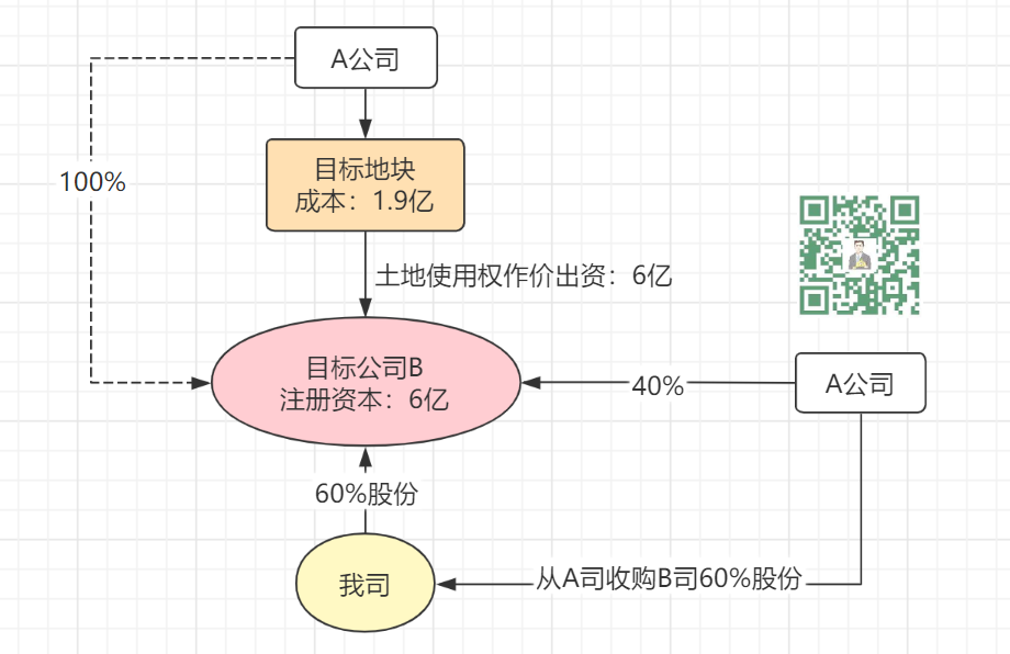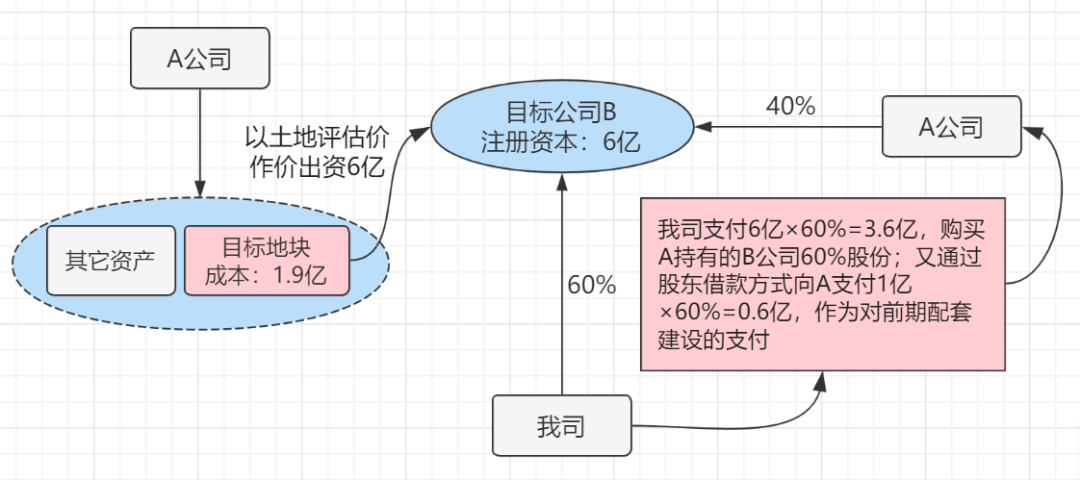 2.【土地作價入股】:A公司單獨成立項目公司。該地政府對于土地作價入股,不視同土地使用權(quán)轉(zhuǎn)讓,不受25%投資額的要求。目標地塊評估價6億元(原始成本1.9億),全部進注冊資本金。由于A公司后期表示想留有部分股權(quán)享受開發(fā)收益,因此在土地作價入股完成后,我司收購60%股權(quán)。