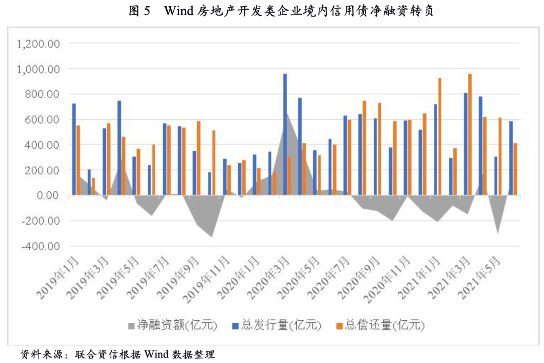 從融資端情況看,伴隨融資政策收緊以及大型地產(chǎn)商負(fù)面事件的沖擊,今年來市場風(fēng)險(xiǎn)偏好下行,房地產(chǎn)企業(yè)融資持續(xù)偏緊。銀行信貸方面,截至2021年6月底房地產(chǎn)開發(fā)貸款余額123,000.00億元,同比增長2.80%,房地產(chǎn)開發(fā)貸余額增速延續(xù)下降態(tài)勢。債券融資方面,受到政策調(diào)控以及市場風(fēng)險(xiǎn)偏好降低影響,自2020年下半年以來凈融資表現(xiàn)持續(xù)走弱,“三條紅線”以來凈融資整體表現(xiàn)為凈流出狀態(tài)。境外債方面,2020年以來整體發(fā)行規(guī)模有所下降。2021年上半年,受“三條紅線”等因素影響,整體發(fā)債速度延續(xù)下降態(tài)勢,凈融資規(guī)模一度轉(zhuǎn)為凈流出。信托融資方面,用益信托網(wǎng)數(shù)據(jù)顯示,上半年房地產(chǎn)集合信托成立規(guī)模2,987.84億元,連續(xù)兩個(gè)半年度回落,也是自2018年以來半年度成立規(guī)模的最低點(diǎn)。