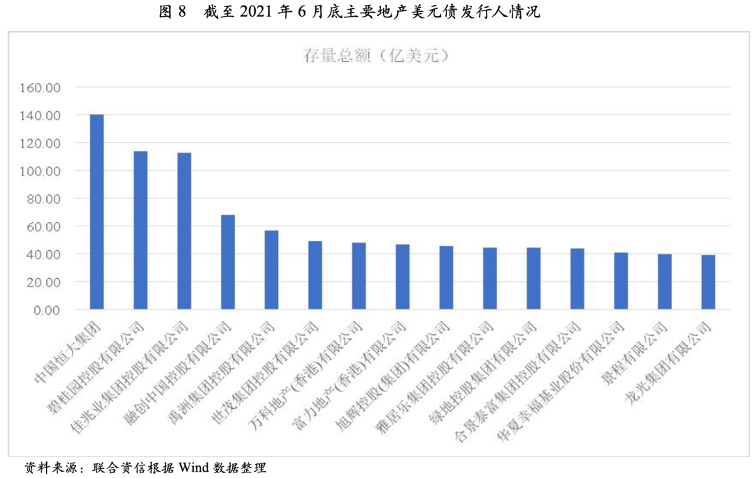 從存量規(guī)模來看,中國恒大集團(tuán)、碧桂園控股有限公司、佳兆業(yè)集團(tuán)控股有限公司美元債存量規(guī)模位居市場前列,易受到境外融資環(huán)境波動(dòng)的影響。