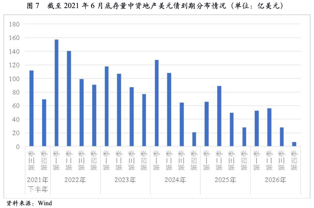 從未來的到期情況看,未來1年房企大量美元債密集到期。截至2021年6月底,未來12個(gè)月內(nèi)逾478億美元債務(wù)面臨到期,其中2022年1季度到期規(guī)模最大,再融資需求大。若市場持續(xù)大幅波動(dòng),將進(jìn)一步加劇房地產(chǎn)企業(yè)再融資壓力。