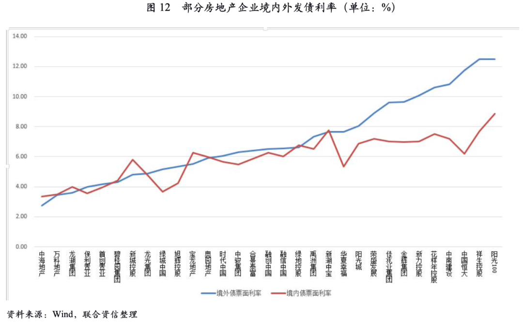 由于部分房地產(chǎn)企業(yè)綜合融資成本難以獲取,我們采用其債券發(fā)行票面利率作為篩選標(biāo)準(zhǔn)。我們以2020年以來,境內(nèi)外市場同時(shí)發(fā)行債券的企業(yè)為研究對(duì)象,對(duì)其發(fā)行債券的票面利率做簡單的算數(shù)平均進(jìn)行對(duì)比。考慮到境外美元債償債資金來源除借新還舊外,實(shí)質(zhì)來自于境內(nèi)公司,因此我們主要選取更能反映公司的真實(shí)信用風(fēng)險(xiǎn)的境外控股公司作為分析標(biāo)的,詳見下圖。