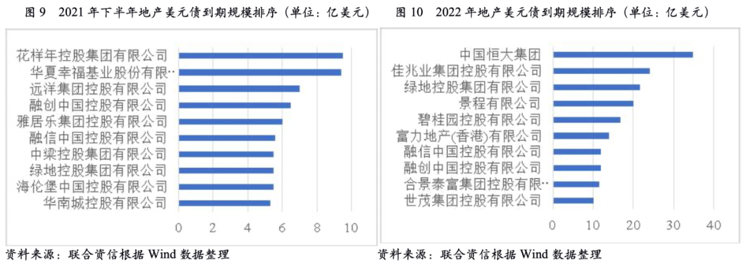 從到期規(guī)模來看,2021年下半年及2022年地產(chǎn)美元債到期規(guī)模較大的房企如下圖所示。其中,2021年下半年到期規(guī)模較大的房企包括花樣年控股集團(tuán)有限公司、華夏幸福基業(yè)股份有限公司、遠(yuǎn)洋集團(tuán)控股有限公司、融創(chuàng)中國控股有限公司、雅居樂集團(tuán)控股有限公司等;2022年到期規(guī)模較大的房企包括中國恒大集團(tuán)、佳兆業(yè)集團(tuán)控股有限公司、綠地控股集團(tuán)有限公司、景程有限公司、碧桂園控股有限公司等。