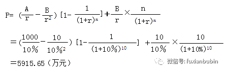 其成立條件:凈收益按等差級數(shù)遞減;凈收益逐年遞減額為B;收益年期有限為n;r大于零。如,根據(jù)被評估企業(yè)的章程,其于評估基準日的剩余經(jīng)營年期為10年,且實際控制方也沒有繼續(xù)經(jīng)營的意愿。若該企業(yè)未來10年的年凈利潤將保持每年10萬元的減少額,且當前的年收益為1000萬元。假定折現(xiàn)率為10%,該企業(yè)的股東全部權(quán)益為: