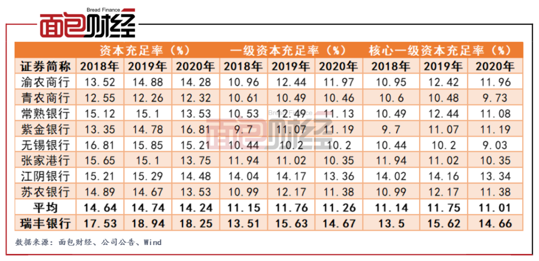 截至2020年末,瑞豐銀行的資本充足率為18.25%;一級資本充足率為14.67%;核心一級資本充足率為14.67%。與其他已上市農商行相比,瑞豐銀行的資本充足率水平不僅處于較高水平,且高于可比上市銀行平均值。