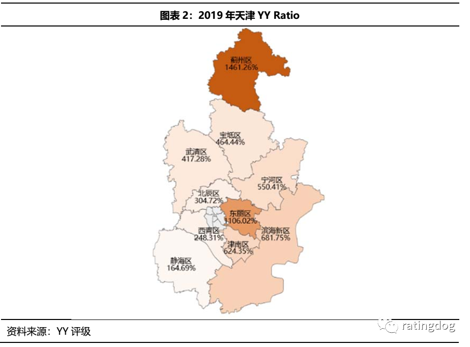 天津市2019年YY Ratio在全國各省(市/區)排名第6,為 618.09%,整體債務壓力較大。分區域來看,薊州區和東麗區YY Ratio最高,均超1000%;其次為濱海新區、津南區和寧河區,YY Ratio均超過了500%。