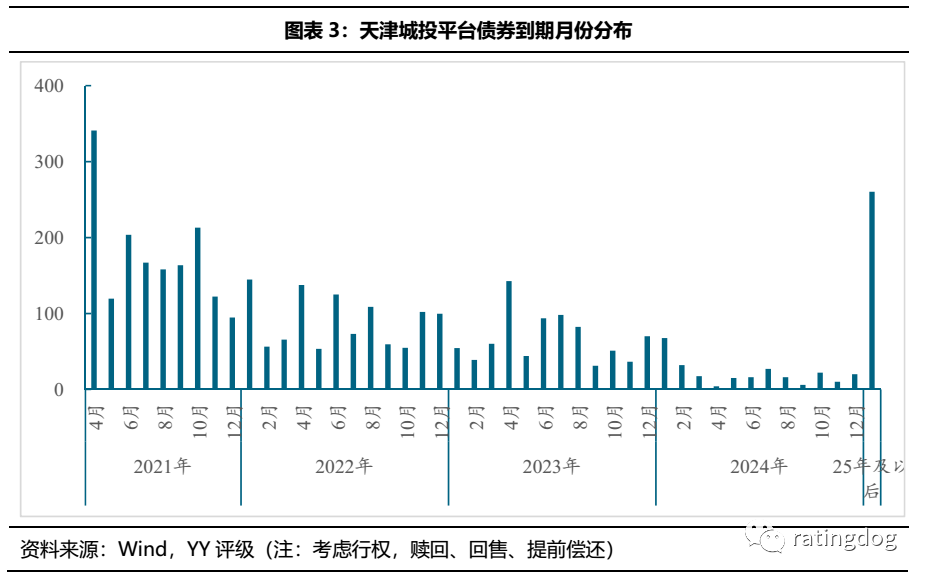 截至21年3月16日,天津區域城投平臺債券余額4,193.19億,其中1,798.60億元將于21年到期,占比42.89%,整體償債壓力較大。從存續債到期月份來看,21年4-11月均有超100億債券到期,其中4月份到期債券超300億。