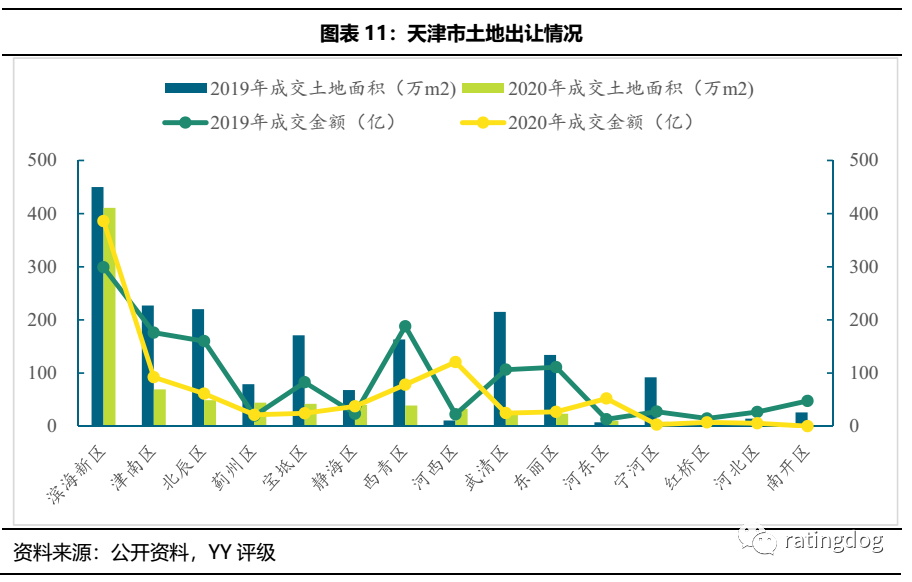 從土地出讓情況來看,2020年相較于2019年,土地出讓面積和成交金額均大幅下降,除河西區土地成交面積較2019年增加以外,其余區域土地成交面積均下降,濱海新區土地成交面積小幅下滑,但成交金額增加。