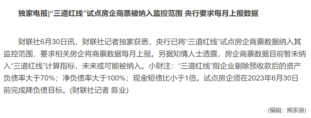 目前的口徑是,“三道紅線”試點(diǎn)房企需要逐月上報(bào)商票數(shù)據(jù),納入監(jiān)控范圍。