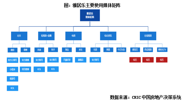 從CRIC監(jiān)測(cè)情況來看,目前雅居樂的媒體矩陣中,橫向矩陣基本覆蓋了各年齡段經(jīng)常使用的平臺(tái),在社交、短視頻、直播、綜合資訊等平臺(tái)均有布局,由于雅居樂跨界綜藝的創(chuàng)新營銷方式,因此媒體矩陣中還包括鮮有房企進(jìn)駐的在線視頻平臺(tái),這也是雅居樂媒體矩陣的特色之一;縱向矩陣中微信布局較為全面,處于行業(yè)內(nèi)中等偏上水平。