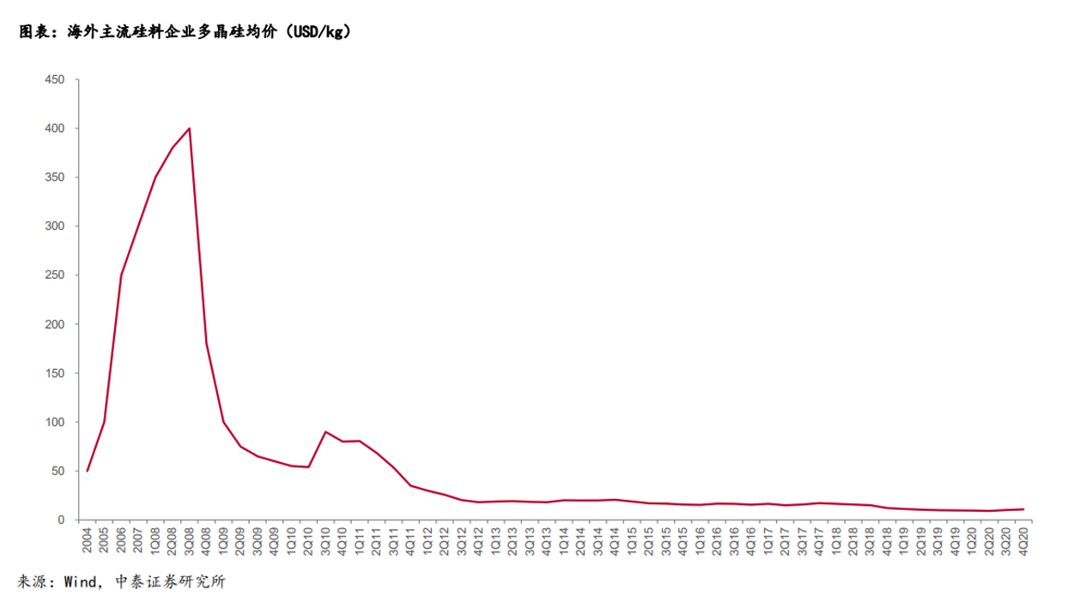 隨后,各路資本瘋狂涌入,供給端大量產能釋放。結果可想而知。多晶硅料從超過400美元的價格,到2008年末已跌至每公斤150美元水平,甚至一路跌到2013年的17美元/KG。