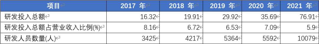 截至2021年12月31日,公司擁有研發技術人員10,079名,其中,擁有博士學歷的 170 名、碩士學歷的2086名,整體研發團隊規模和實力在行業內處于領先地位。截至 2021年12月31日,公司及子公司共擁有3772項境內專利及673項境外專利,正在申請的境內和境外專利合計5777項。