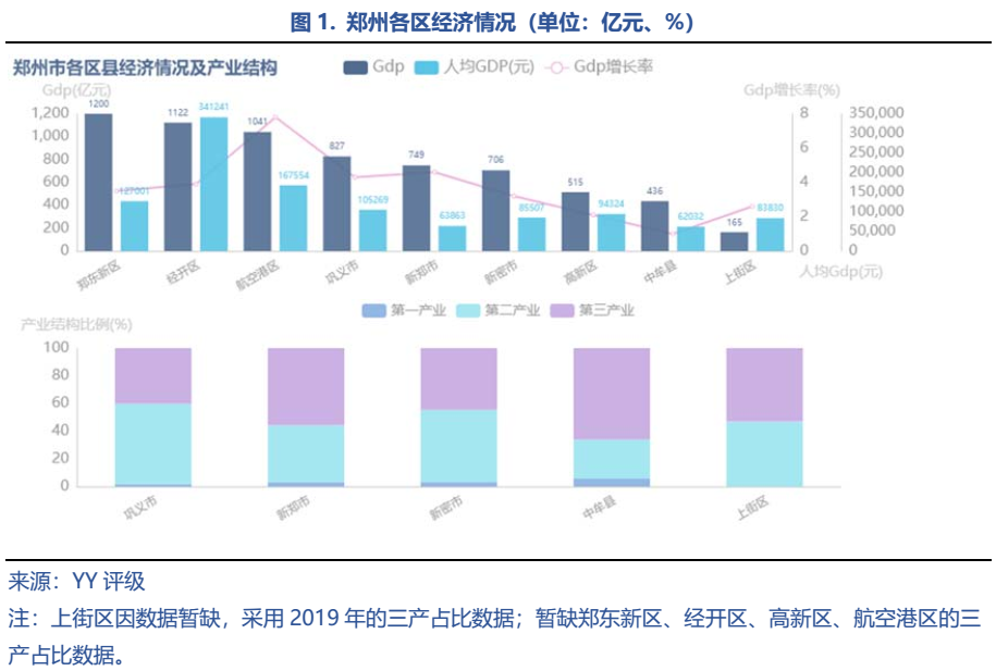 鄭州市現(xiàn)轄6區(qū)5市1縣及鄭州航空港經(jīng)濟(jì)綜合實(shí)驗(yàn)區(qū)、鄭東新區(qū)、 鄭州經(jīng)濟(jì)技術(shù)開發(fā)區(qū)、鄭州高新技術(shù)產(chǎn)業(yè)開發(fā)區(qū),四大園區(qū)定位各不相同:航空港區(qū)是我國第一個(gè)以航空經(jīng)濟(jì)為引領(lǐng)的國家級新區(qū);鄭東新區(qū)則是中原經(jīng)濟(jì)區(qū)金融集聚核心功能區(qū)、全省推進(jìn)城鎮(zhèn)化建設(shè)的先行區(qū)和國家大數(shù)據(jù)綜合試驗(yàn)區(qū)核心區(qū);經(jīng)開區(qū)側(cè)重發(fā)展了汽車及零部件、裝備制造、現(xiàn)代物流三大千億級主導(dǎo)產(chǎn)業(yè);高新區(qū)則定位于“發(fā)展高科技、實(shí)現(xiàn)產(chǎn)業(yè)化”,擁有完善的創(chuàng)新孵化培育體系。鄭州共有9個(gè)發(fā)債區(qū)縣,在發(fā)債各區(qū)中,鄭東新區(qū)GDP總量領(lǐng)跑,人均GDP位居前三,經(jīng)濟(jì)實(shí)力較強(qiáng)。以汽車和裝備制造等為主導(dǎo)產(chǎn)業(yè)的鄭州經(jīng)開區(qū)人均GDP一馬當(dāng)先,高達(dá)34.1萬元居全市首位,GDP總量在2019年首破千億大關(guān)的基礎(chǔ)上也再創(chuàng)新高。此外,航空港區(qū)GDP也過千億大關(guān),上街區(qū)、中牟縣和高新區(qū)則以較低的GDP總量居末尾。