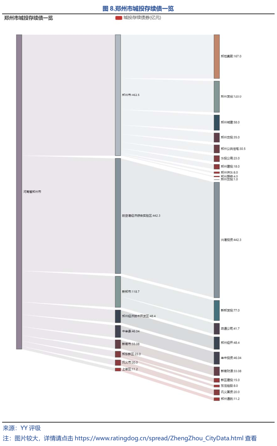 截至2021年7月8日,鄭州市的發(fā)債平臺主要分布在地市級、功能區(qū)和郊縣,平臺存續(xù)債合計(jì)規(guī)模超1,200億元。市級平臺債務(wù)主要集中在鄭地集團(tuán)和鄭州發(fā)投,分別占全部市級城投存續(xù)債的36.1%和25.9%;從各區(qū)看,航空港經(jīng)濟(jì)綜合實(shí)驗(yàn)區(qū)城投存續(xù)債規(guī)模最大,存續(xù)債券余額有442.3億元,且均屬于興港投資的債務(wù)。排第二位的為新鄭市,債務(wù)集中在新鄭發(fā)投和政通公司。