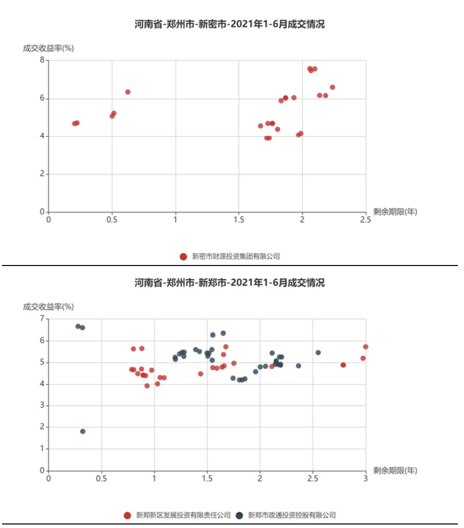 將鄭州市城投平臺按照行政層級和所屬區(qū)域,分為9類分別展示成交情況。具體來看,鄭州市級平臺成交活躍,成交收益率分散在3%~6%,基本隨著剩余期限遞增;中牟縣成交收益率相對較高,在5%~7%;鞏義市分散在3%~4%和6%~7%兩個(gè)區(qū)間;新鄭市、航空港區(qū)、鄭東新區(qū)均集中在4%~6%;經(jīng)開區(qū)集中在4%附近;新密市成交收益率相對分散;上街區(qū)僅一個(gè)成交主體。