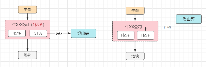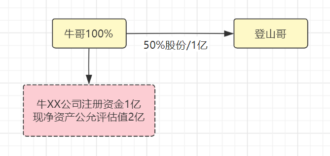 牛XX公司,雖然當年注冊資金1億,但土地升值,按凈資產公允評估價2億,轉讓股份50%給登山哥,登山哥需要支付1億。