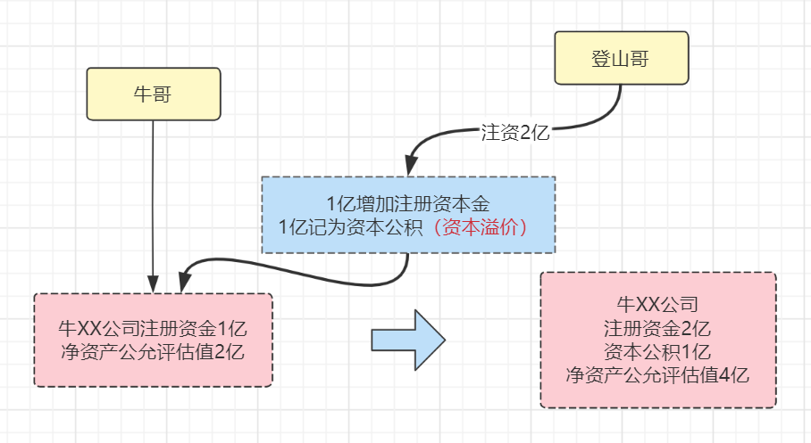 通過平價增資,登山哥需要掏2億,其中1億增加注冊資本金,1億計入資本公積。