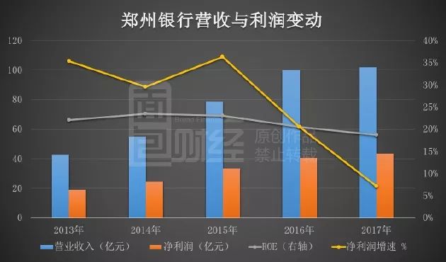 翻查財報,鄭州銀行營業(yè)收入由2013年的42.57億元,上升至2017年的102.13億元,增幅139.91%。同期,凈利潤由19.02億元增至43.34億元,增長127.86%。