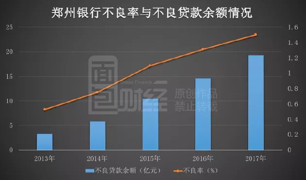 值得注意的是鄭州銀行的不良率變動趨勢。最近5年,鄭州銀行的不良率與不良貸款呈明顯的上升趨勢。如下圖所示: