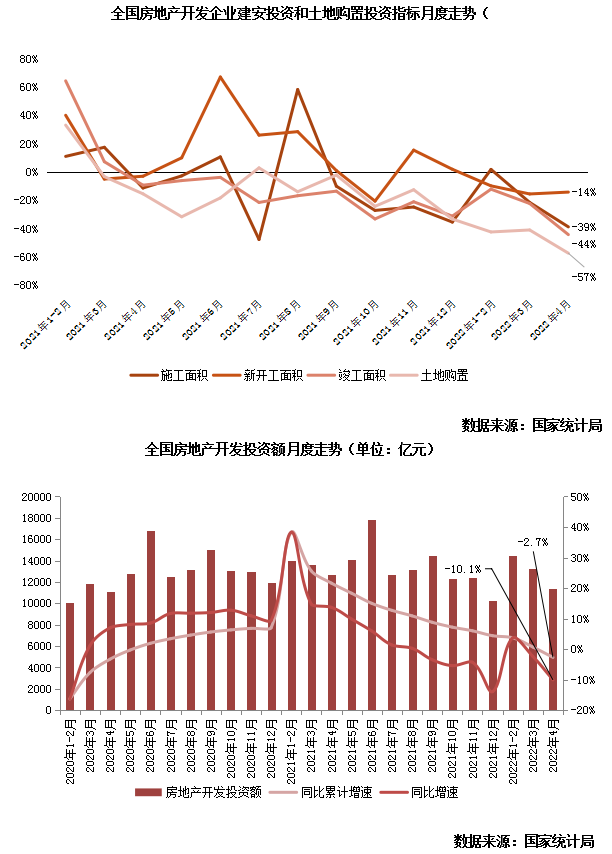 全國(guó)房地產(chǎn)企業(yè)房屋施工、新開工、竣工三個(gè)不同階段規(guī)模指標(biāo)均創(chuàng)史低,增速大降的主要原因在于疫情管控極大影響了項(xiàng)目施工強(qiáng)度。新開工項(xiàng)目難以做到“應(yīng)開盡開”、在建項(xiàng)目頻遭停工、竣工項(xiàng)目也無(wú)法如期竣工。此外由于房地產(chǎn)業(yè)和建筑業(yè)信心受挫,新開工和竣工規(guī)模更是一降再降。