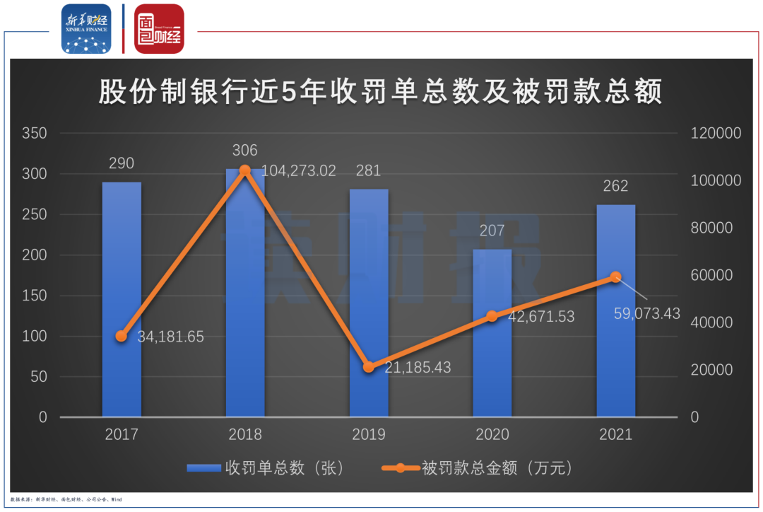 2021年(以處罰日計(jì))涉及股份制上市銀行的機(jī)構(gòu)罰單總數(shù)為262張,較上年增加55張,增幅達(dá)26.57%;被罰款總金額約5.91億元,較上年增加1.64億元,增幅達(dá)38.44%。