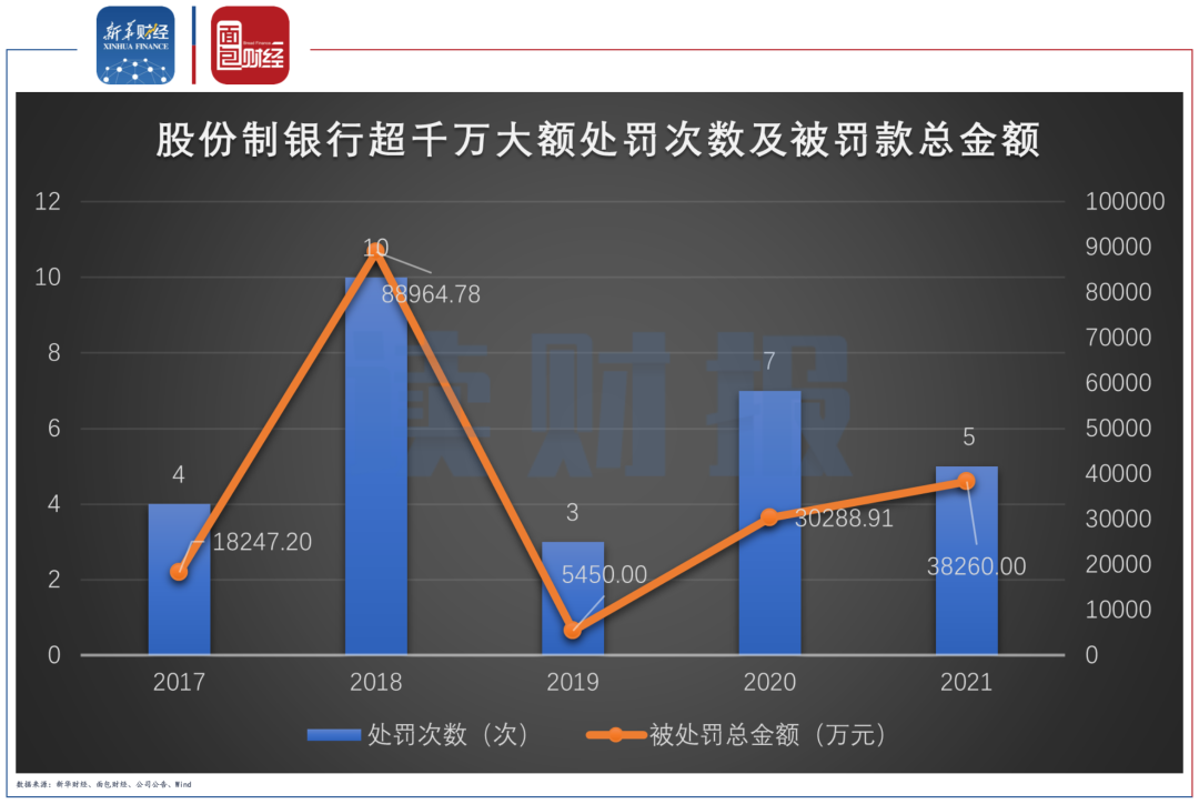 在收罰單總數(shù)量及被罰款金額均增長(zhǎng)的前提下,股份制銀行單張被罰款金額超過(guò)1000萬(wàn)元的罰單,由2020年的7張降至2021年的5張,但被罰款總額由2020年的3.03億元增至3.83億元;民生銀行、華夏銀行、招商銀行、浦發(fā)銀行和中信銀行各占1起,其中有4張為金額超過(guò)5000萬(wàn)元的“巨額罰單”。