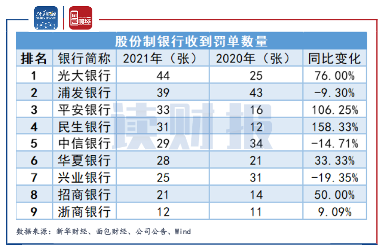 從前述統(tǒng)計(jì)分析來(lái)看,民生銀行和平安銀行2021年收罰單數(shù)量均較2020年翻倍增長(zhǎng)。