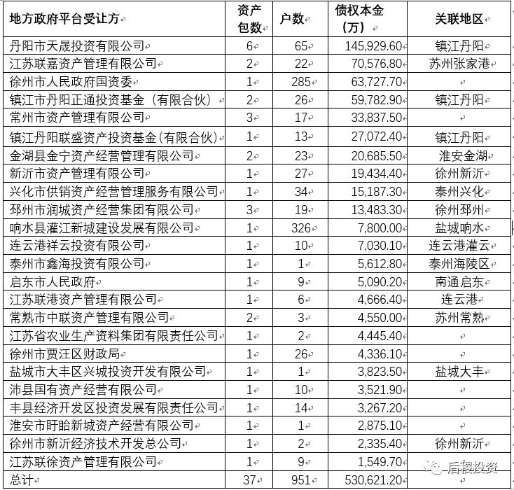二級市場中,江蘇市場還有一個典型特征,就是地方政府的深度參與。與省外其他地區,地方政府的參與的形式主要是協調金融機構與法院相比,江蘇省各區縣政府,尤其是蘇北部分地區,地方政府直接或間接通過平臺公司,直接收購本地區的不良債權來達到化解本地債務危機的目的。