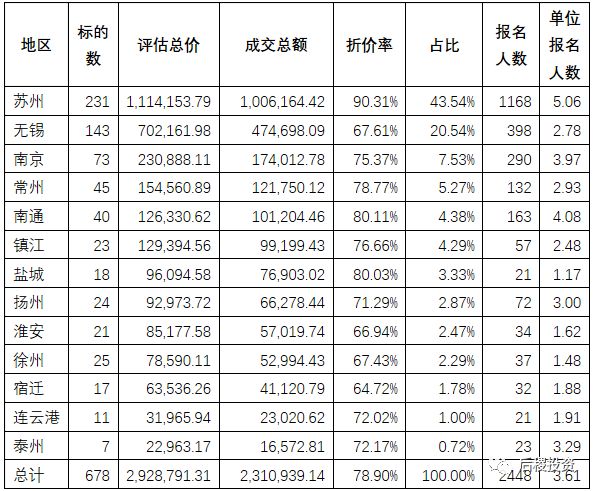 江蘇全省規模以上拍品總成交金額超過了230億元,其中蘇州地區拍品成交額占江蘇全省高達43.54%,遙遙領先其他地區,包括蘇州在內的傳統蘇南四市成交總額位居前四,總占比達76.88%,由此可推測,蘇南四市的不良貸款余額應占全省的絕大比重。