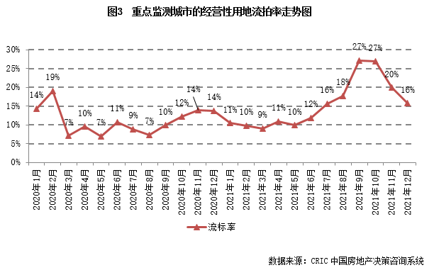 土地流拍方面。由于房地產(chǎn)行業(yè)信貸環(huán)境邊際改善逐漸起效,12月土地市場的運行也較上月表現(xiàn)趨于平穩(wěn),土地流拍現(xiàn)象較此前也略有改善。本月流拍率降至16%,較年內(nèi)高峰期下降了十個百分點以上。結(jié)合流拍地塊所在城市來看,集中土拍的重點城市仍是土地流拍主力,尤其是長春、沈陽,因樓市下行壓力較大,房企投資意愿較低,在第三輪集中土拍均有半數(shù)以上的地塊遭遇流拍,是21城中流拍現(xiàn)象最嚴重的兩個城市。