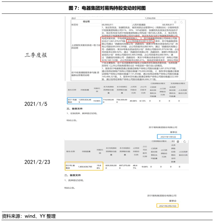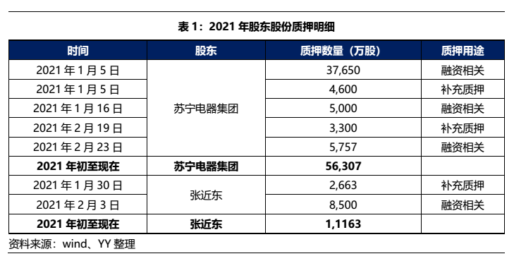 從時間線及主體來看,2021年以來電器集團(tuán)共質(zhì)押了近5.63億股,張近東共質(zhì)押了1.12億股,主要用于補(bǔ)充質(zhì)押和融資相關(guān)。截至2021年2月23日,蘇寧電器集團(tuán)持有公司19.88%的股份,共計質(zhì)押8.97億股,占所持股份的48.47%;截至2021年2月3日,張近東及一致行動人蘇寧控股集團(tuán)有限公司合計持有公司24.94%股份,共計質(zhì)押4.11億股,占所持股份的17.72%。
