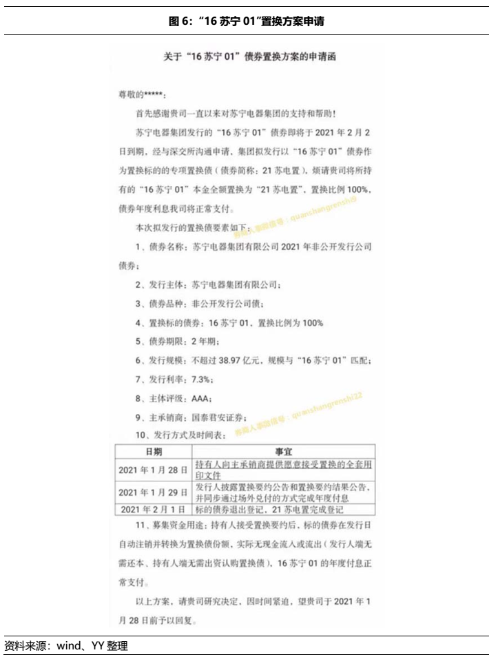 1月26日,電器集團(tuán)召開千萬以上持有人會議,擬發(fā)行以“16蘇寧01"債券作為置換標(biāo)的的專項置換債“21蘇電置”,置換比例為100%,發(fā)行規(guī)模與16蘇寧01匹配,不超過38.97億元,發(fā)行利率為7.3%,持有人接受置換要約后,標(biāo)的債券在發(fā)行日自動注銷并轉(zhuǎn)換為置換債份額,實(shí)際無現(xiàn)金流入或流出,16 蘇寧01的年度付息正常支付。此番操作,無疑是再融資受阻下的決定,最終置換債“21蘇電01”發(fā)行28.54億元。
