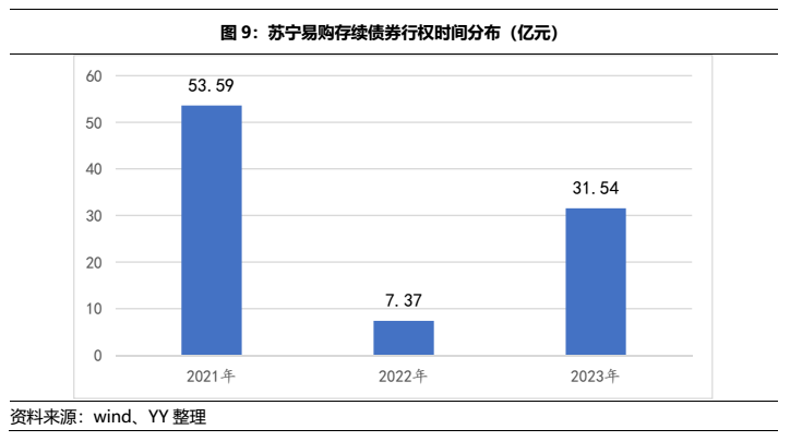 截至2021年3月1日,蘇寧易購存續(xù)債券12只共計92.13億元,其中包含4只ABS共計33.54億元。按行權(quán)時間統(tǒng)計,最近一只是即將在4月19日到期的 “18蘇寧01”,余額13.32億元。從時間段來看,2021年需行權(quán)53.59億元,2022年面臨7億元的行權(quán)壓力(為19云智優(yōu)),2023年需行權(quán)31.54億元(包括15.924億元的20云享A、6.635億元的20云享B、3.981億元的20云享C)。