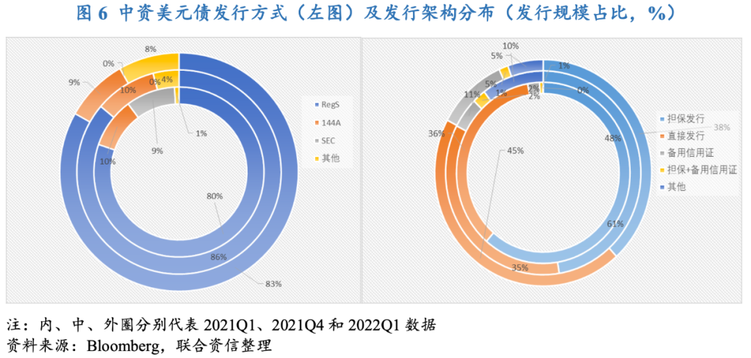 從發(fā)行架構(gòu)[6]看,2022年一季度,擔(dān)保發(fā)行和直接發(fā)行仍是中資美元債最主要的兩種發(fā)行架構(gòu)。具體來(lái)看,采用直接發(fā)行的債券發(fā)行金額達(dá)到168.4億美元,占總規(guī)模比為44.5%,環(huán)比和同比分別上升9.2個(gè)和8.7個(gè)百分點(diǎn),首次超過(guò)擔(dān)保發(fā)行的債券規(guī)模;采用擔(dān)保發(fā)行的發(fā)行規(guī)模達(dá)到144.6億美元,約占總發(fā)行規(guī)模的38.2%,環(huán)比和同比分別下滑9.2個(gè)和23.1個(gè)百分點(diǎn);采用備用信用證發(fā)行的債券的發(fā)行規(guī)模達(dá)40.2億美元,占總規(guī)模的10.6%,環(huán)比和同比上漲5.8個(gè)和8.4個(gè)百分點(diǎn),由于備用信用證發(fā)行架構(gòu)采用境內(nèi)銀行背書(shū)的方式對(duì)債券形成一定外部信用支撐且成本相對(duì)較低,因此在房地產(chǎn)信用風(fēng)險(xiǎn)外溢的背景下,采用備用信用證發(fā)行架構(gòu)的方式正逐步受到投資人青睞;采用擔(dān)保+備用信用證的債券發(fā)行規(guī)模達(dá)5.2億美元,占總規(guī)模的1.4%,環(huán)比下滑0.8個(gè)百分點(diǎn),但同比上漲0.8個(gè)百分點(diǎn);此外,本季度沒(méi)有以維好架構(gòu)以及擔(dān)保+維好雙重架構(gòu)增信的中資美元債,表明市場(chǎng)對(duì)于維好架構(gòu)的增信作用越來(lái)越不認(rèn)可。
