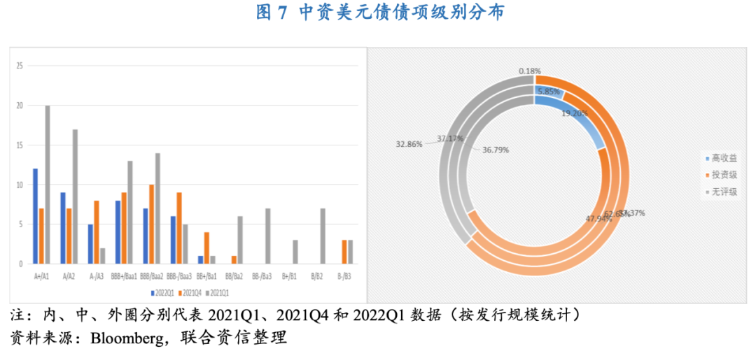 在有評(píng)級(jí)的中資美元債中,2022年一季度投資級(jí)中資美元債發(fā)行規(guī)模為237.1億美元,合計(jì)占總發(fā)行規(guī)模的62.7%,環(huán)比和同比分別上漲了5.3個(gè)和14.7個(gè)百分點(diǎn)。此外,高收益中資美元債(BBB-級(jí)以下[8])受信用風(fēng)險(xiǎn)事件持續(xù)發(fā)酵的影響而發(fā)行驟減,本季度發(fā)行規(guī)模僅為0.7億美元,占總發(fā)行規(guī)模的0.2%,環(huán)比和同比分別下滑5.7個(gè)和19.0個(gè)百分點(diǎn)。