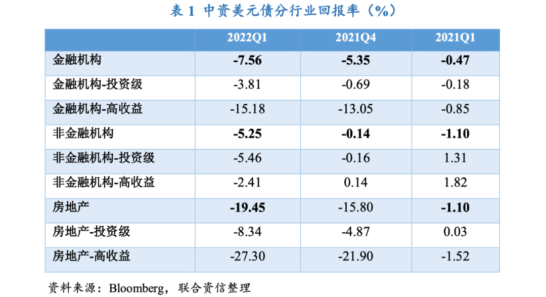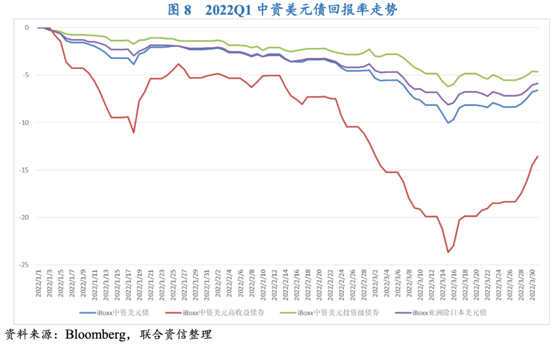 2022年一季度,從宏觀環(huán)境上看,受美聯(lián)儲(chǔ)加速貨幣政策調(diào)整以及俄烏沖突爆發(fā)的影響,投資者避險(xiǎn)情緒得到明顯增強(qiáng),對(duì)中資美元債的投資需求有所下降。中國(guó)3月疫情再度蔓延且政府采取嚴(yán)格的疫情防控舉措,對(duì)中國(guó)經(jīng)濟(jì)增長(zhǎng)以及部分中資企業(yè)復(fù)工復(fù)產(chǎn)造成一定影響,國(guó)際投資者對(duì)中資企業(yè)表現(xiàn)稍有悲觀。另一方面,本季度信用風(fēng)險(xiǎn)事件仍在持續(xù)發(fā)酵,其中中國(guó)奧園、正榮地產(chǎn)和融創(chuàng)中國(guó)等爆發(fā)的信用風(fēng)險(xiǎn)事件進(jìn)一步加重了市場(chǎng)的擔(dān)憂情緒,多重因素作用下本季度中資美元債回報(bào)率延續(xù)了下跌走勢(shì)。但3月中旬,多部委聯(lián)合發(fā)聲對(duì)市場(chǎng)情緒起到一定提振作用,各板塊中資美元債回報(bào)率也隨之應(yīng)聲上漲,其中高收益中資美元債漲幅較大。