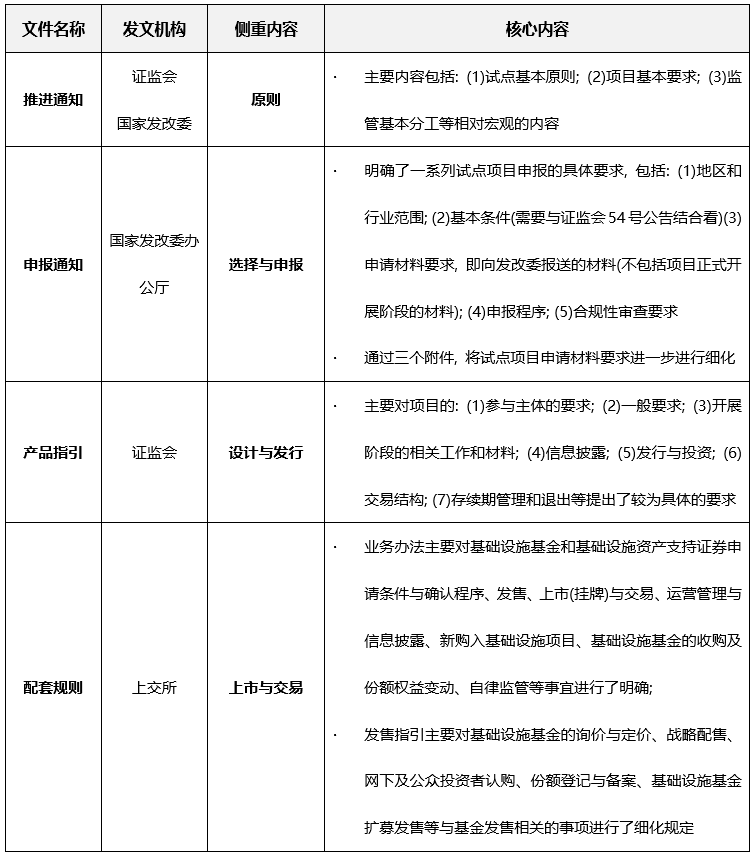 結(jié)合此前已經(jīng)頒布的包括《關(guān)于推進基礎(chǔ)設(shè)施領(lǐng)域不動產(chǎn)投資信托基金(REITs)試點相關(guān)工作的通知》(“40號通知”或“推進通知”)、《關(guān)于做好基礎(chǔ)設(shè)施領(lǐng)域不動產(chǎn)投資信托基金(REITs)試點項目申報工作的通知》(“586號文”或“申報通知”)、《公開募集基礎(chǔ)設(shè)施證券投資基金指引(試行)》(“54號公告”或“產(chǎn)品指引”), 我們認為, 配套規(guī)則和上述規(guī)范性文件, 具有清晰的層次和明確的分工, 分別從原則、選擇與申報、設(shè)計與發(fā)行、上市與交易的角度, 共同完善并構(gòu)成了公募REITs業(yè)務(wù)的規(guī)則體系。