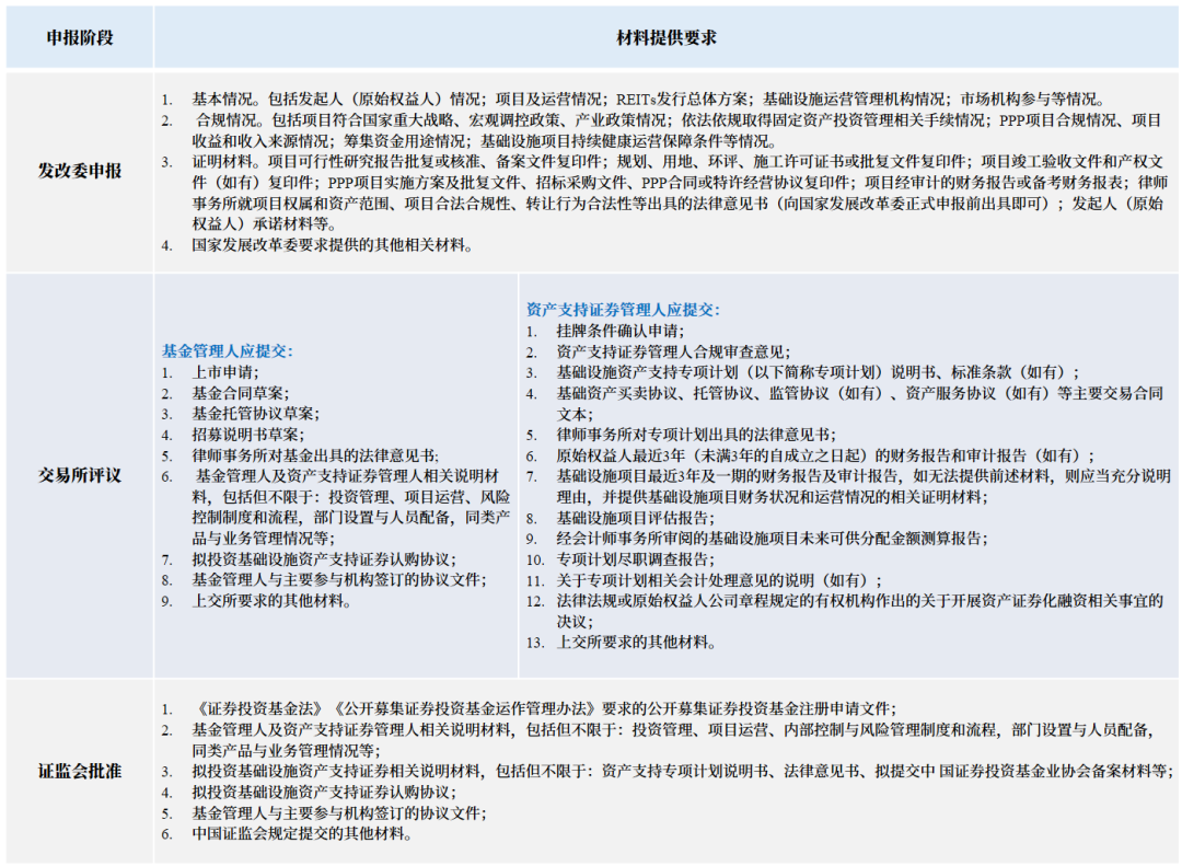 其二, 對市場機構(gòu)關(guān)注的公募REITs申請材料(見下方表格梳理)、無異議函等問題進行了明確。公募REITs申請上市需提交的材料多于普通基金產(chǎn)品, 信息披露要求更高; 對于通過審核的公募REITs產(chǎn)品, 交易所將對資產(chǎn)支持證券及公募基金合并出具無異議函; 此外, 明確了公募REITs新購入基礎(chǔ)設(shè)施項目的, 則需向交易所提交變更申請并重新取得無異議函。