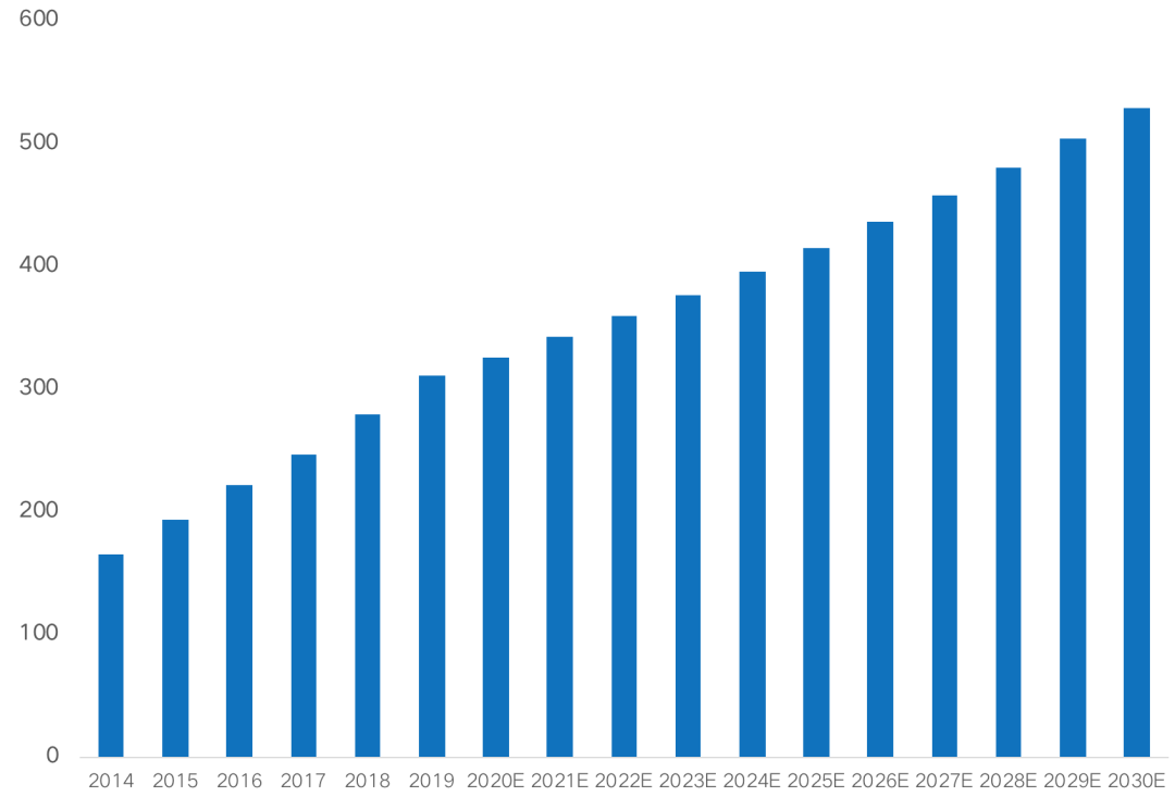 圖:2019-2030年基礎物業服務市場規模預測(億㎡)