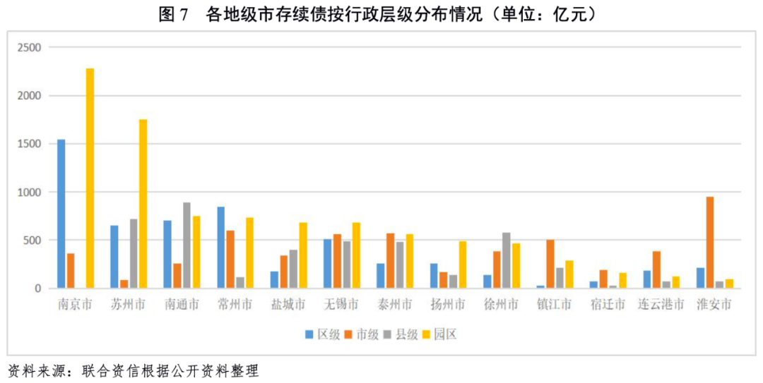 江蘇省城投債發行及存續規模大,主要集中于蘇南地區,南京市新發及存續規模最大,宿遷市最小。蘇南地區城投債發行成本優勢明顯,宿遷市、鎮江市和鹽城市發債成本省內相對較高;蘇南地區存續城投債信用等級整體高于蘇中及蘇北地區,徐州、揚州及宿遷市存續債以AA級為主;蘇南地區低行政層級的城投企業存續債規模高于蘇中及蘇北地區,其中南京市、蘇州市和無錫市以園區級發債城投企業為主,下沉程度較高。