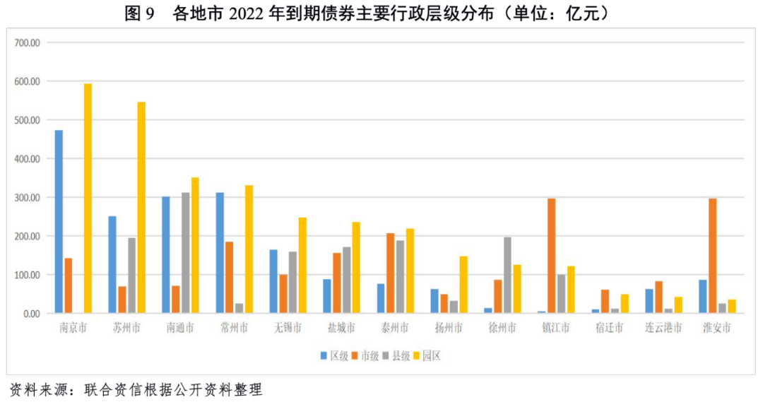 從2022年到期城投債行政層級看,江蘇省2022年存續債到期城投企業行政層級以較低的區縣及園區為主;從各地市看,除鎮江、宿遷、連云港及淮安市到期城投債券行政層級以市級為主外,其余地市均以區縣及園區級為主,其中徐州市以縣級平臺為主;常州市、連云港市、南京市區級城投債到期占比超過30%;南京市、蘇州市、無錫市、鹽城市、揚州市以園區平臺為主,其中南京市、蘇州市和揚州市園區級平臺存續債到期規模占比分別為49.10%、51.04%和50.53%;淮安市和鎮江市市級平臺存續債到期規模占比分別為66.54%和56.55%。