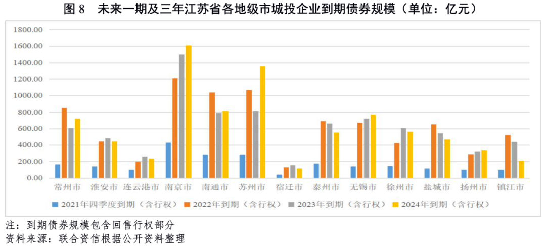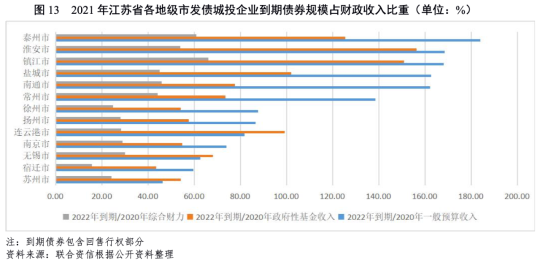 我們以城投企業2022年到期債券規模占一般公共預算收入或政府性基金收入的比重來衡量一般公共預算收入或政府性基金收入對到期債券的覆蓋情況,償債能力偏弱的城市為泰州市、淮安市和鎮江市;以城投企業2022年到期債券占2020年地方政府綜合財力的比重來近似衡量2022年城投債券的到期償還能力,泰州市、鎮江市和淮安市城投企業2022年到期債券占地方政府綜合財力的占比分別為60.86%、66.17%和53.92%。總體看,泰州市、鎮江市和淮安市城投企業2022年到期債券的償還能力偏弱。