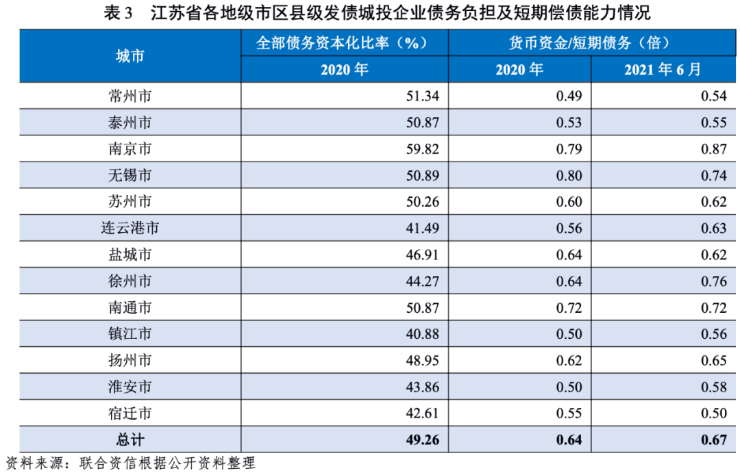 2020年,江蘇省發債城投企業債務負擔有所加重,常州市、南京市、泰州市城投企業債務負擔較重;短期償債能力指標有所弱化,鎮江市城投企業短期償債能力相對較弱,常州市和泰州市區縣級城投企業短期償債壓力較大。江蘇省城投企業整體融資環境良好,城投企業凈融資持續增長,2020年增速同比下滑,淮安市城投企業凈融資同比降幅較大;2021年上半年,江蘇省城投企業債券凈融資情況整體較好,宿遷市和鎮江市凈融資額偏低,進度偏慢。